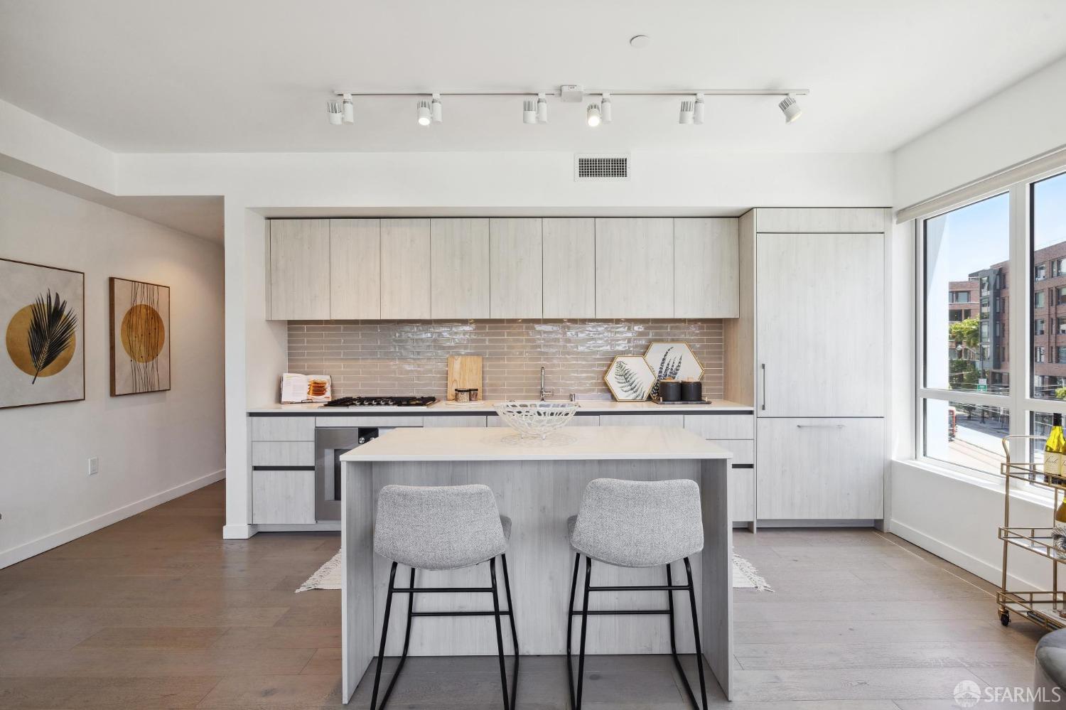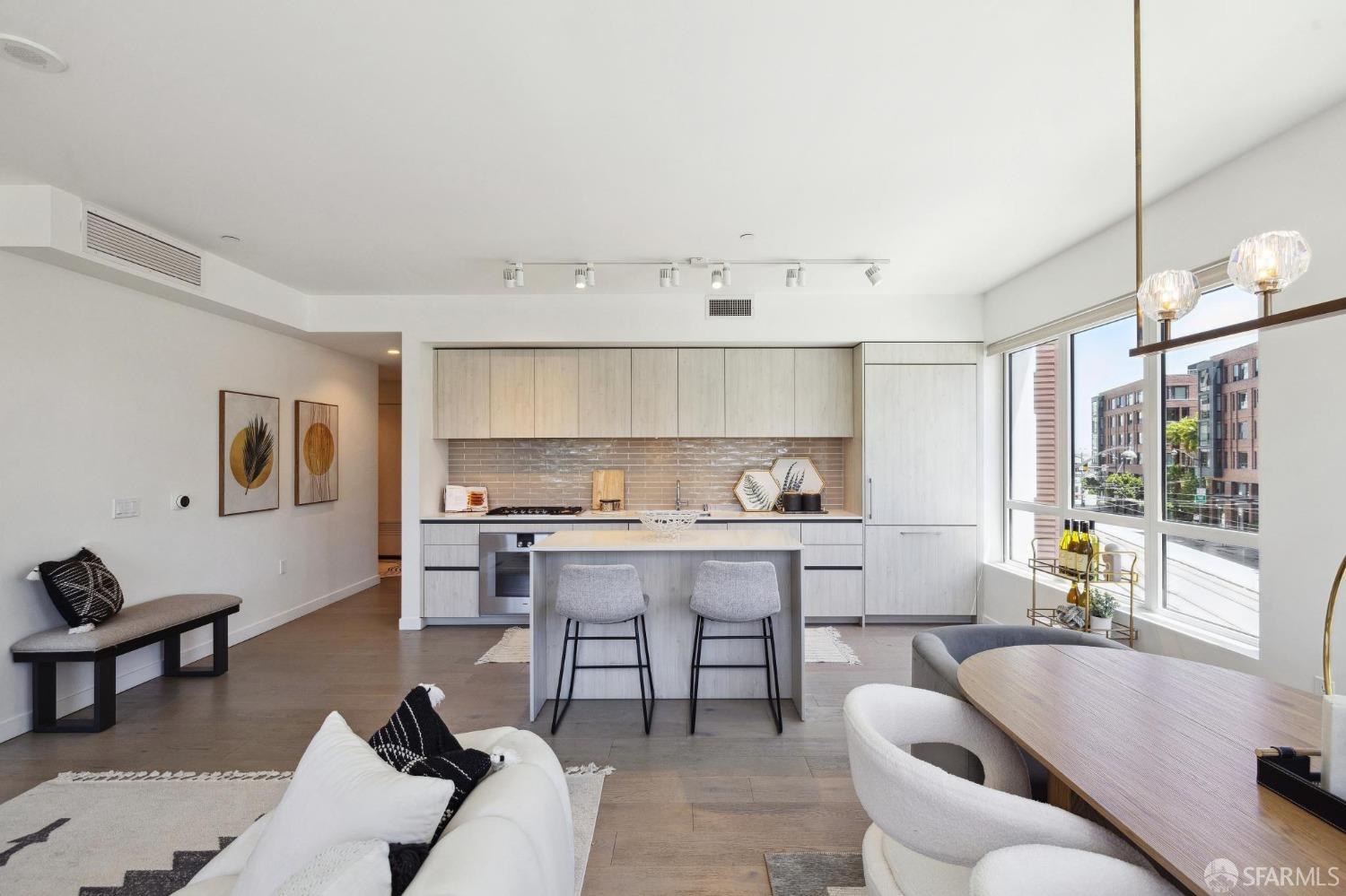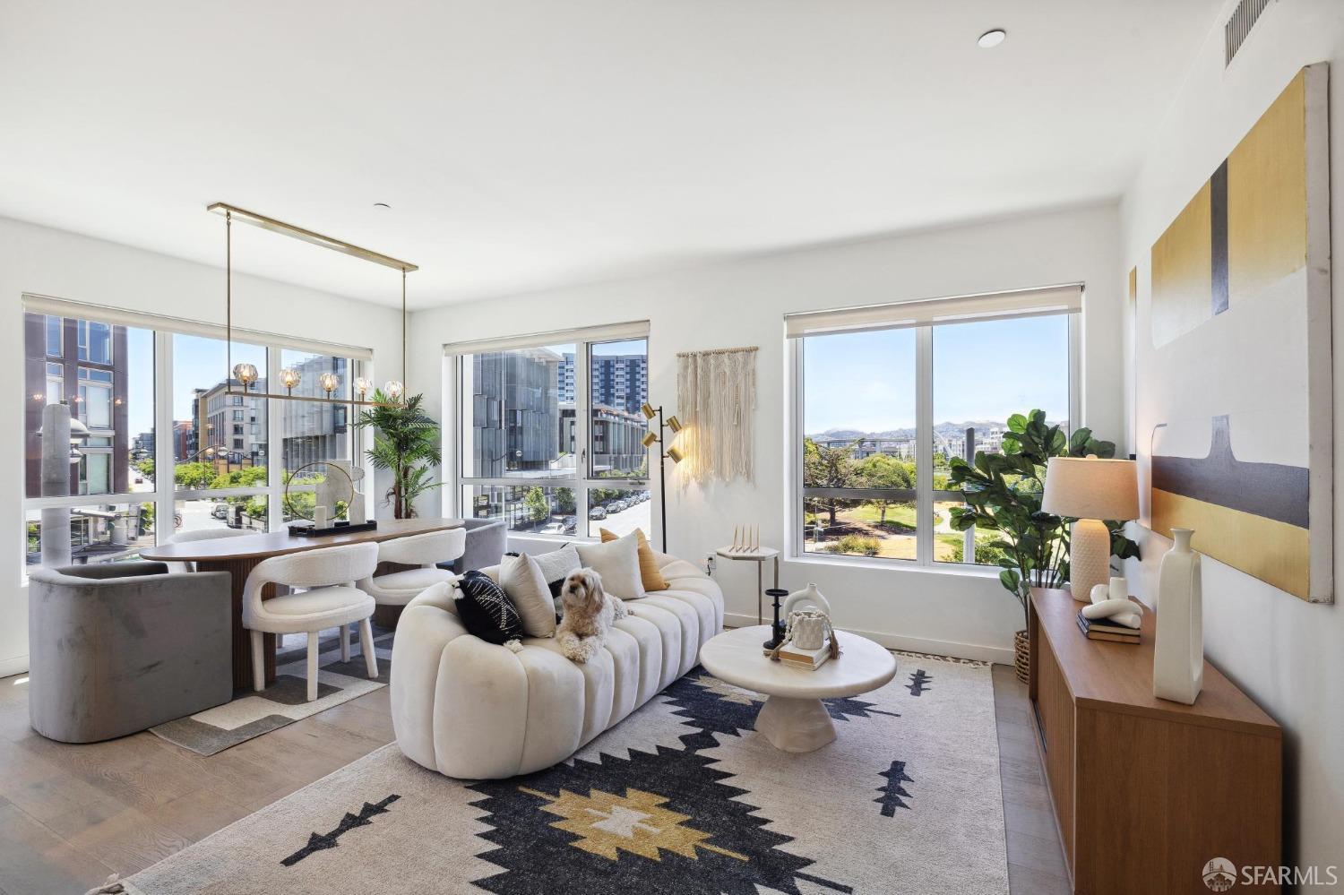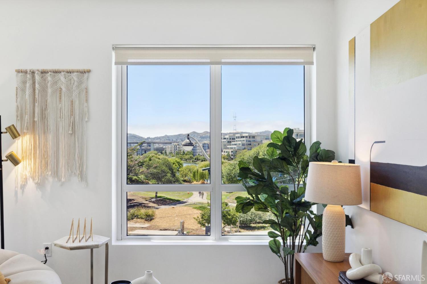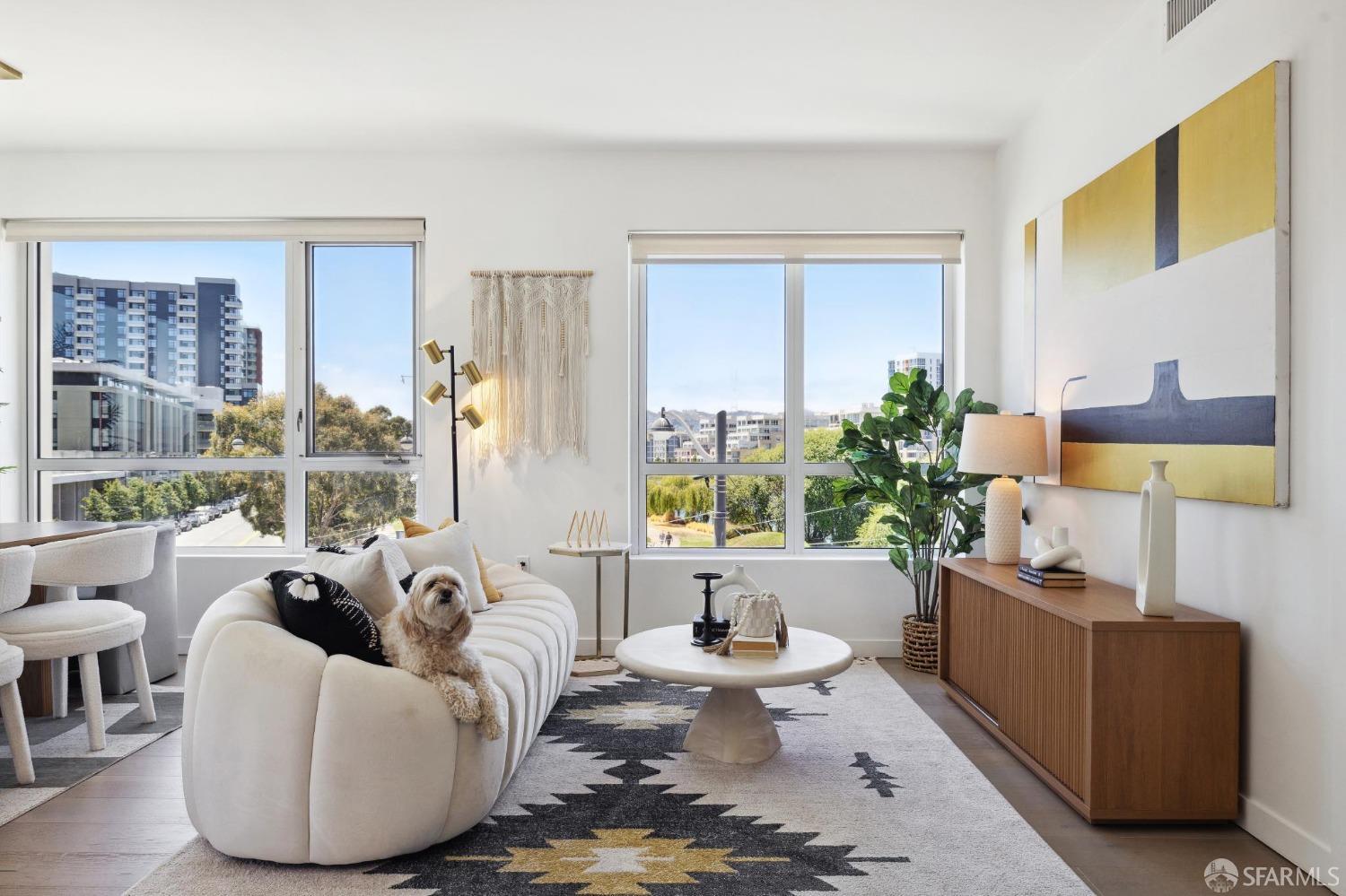 Discover breathtaking sunsets from this rare, pristine 3 bed 2 bath corner home boasting exceptional views of Mission Creek, Twin Peaks, and Sutro Tower. Southwest exposure floods the space with natural light year-round. The galley kitchen features a movable island, abundant storage, 5-burner gas stove, and luxury appliances cleverly integrated into the cabinetry. Motorized blinds, custom closets, Nest thermostat, and in-unit washer dryer enhance convenience. Enjoy 1 car parking in this chic abode at One Mission Bay, offering luxury amenities like a 24-hour doorperson, heated outdoor pool, dining and lounge areas, fitness center, business center, and a guest suite. Welcome to San Francisco living at its finest!
