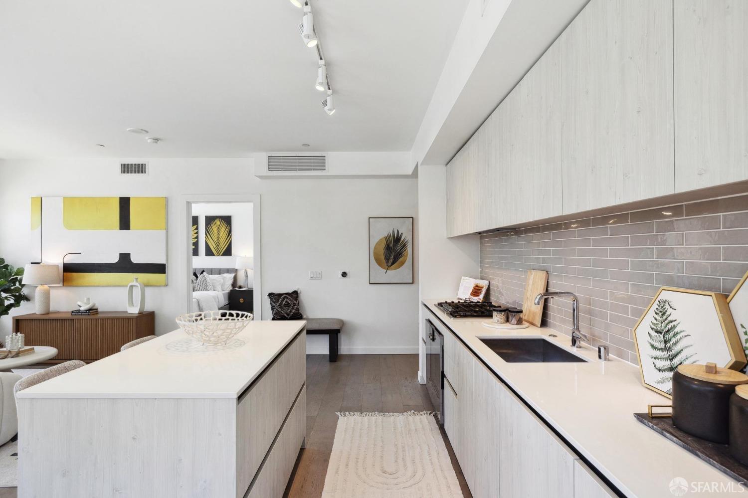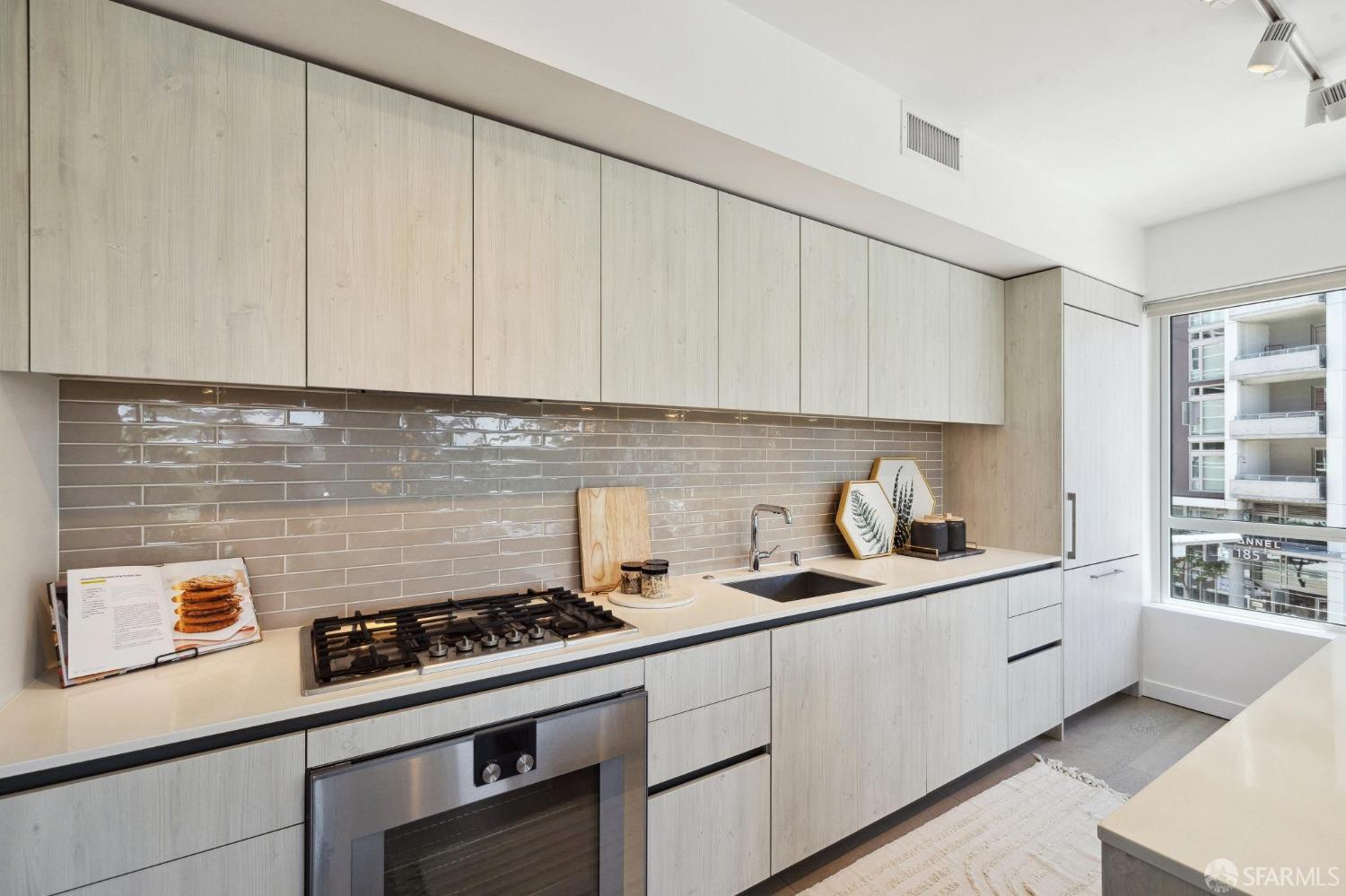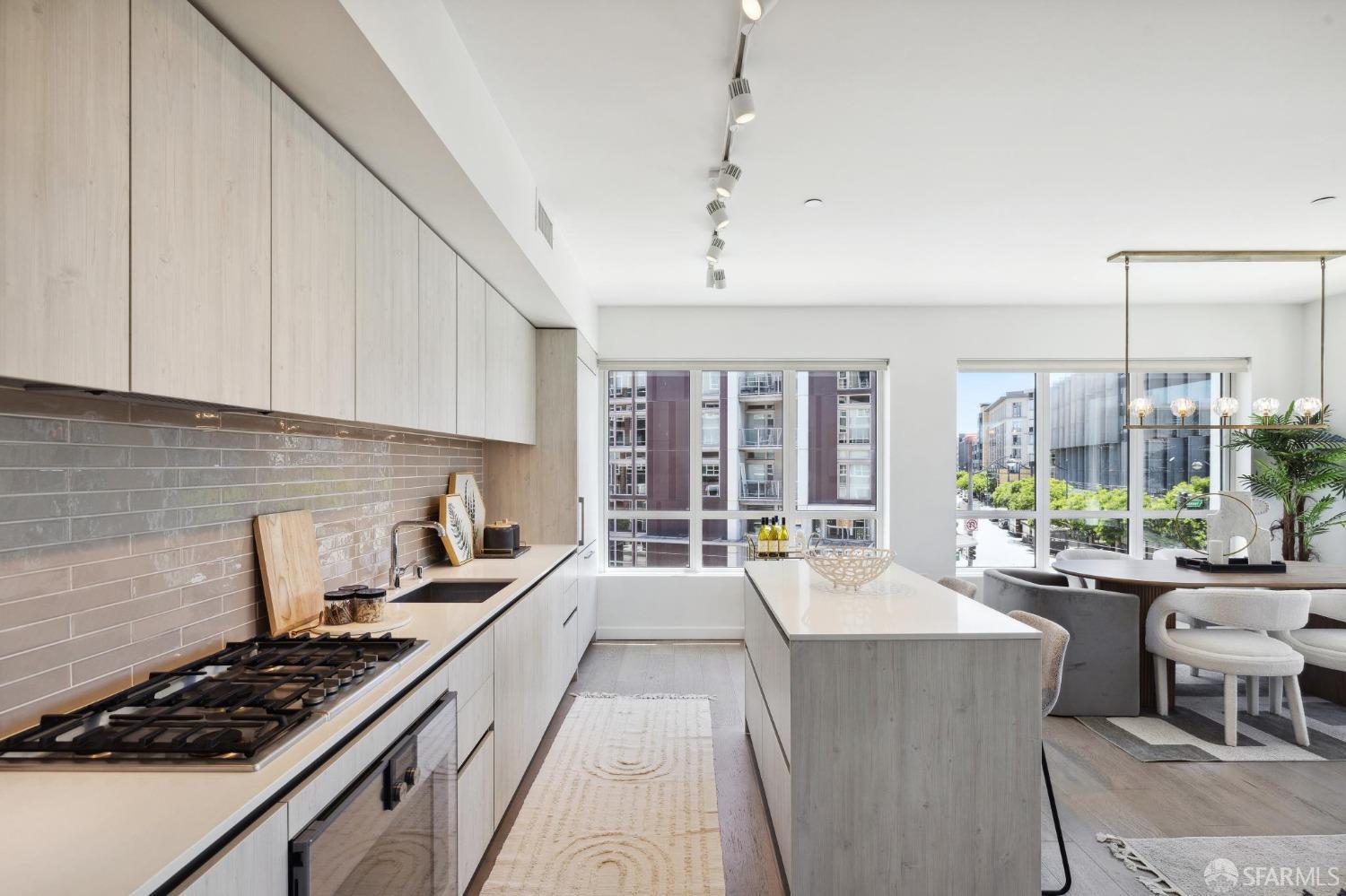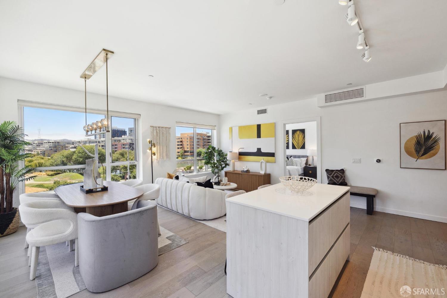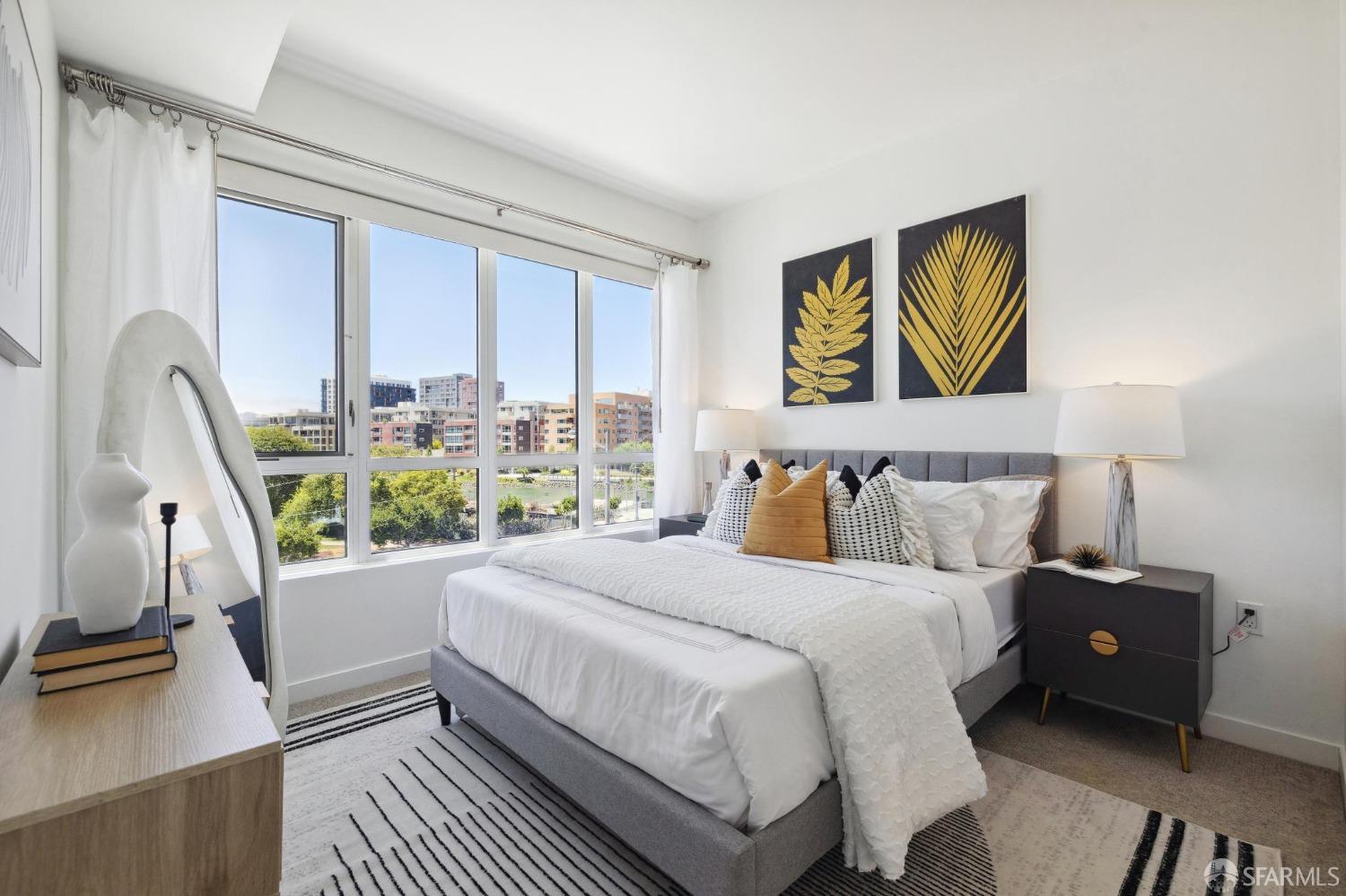 Discover breathtaking sunsets from this rare, pristine 3 bed 2 bath corner home boasting exceptional views of Mission Creek, Twin Peaks, and Sutro Tower. Southwest exposure floods the space with natural light year-round. The galley kitchen features a movable island, abundant storage, 5-burner gas stove, and luxury appliances cleverly integrated into the cabinetry. Motorized blinds, custom closets, Nest thermostat, and in-unit washer dryer enhance convenience. Enjoy 1 car parking in this chic abode at One Mission Bay, offering luxury amenities like a 24-hour doorperson, heated outdoor pool, dining and lounge areas, fitness center, business center, and a guest suite. Welcome to San Francisco living at its finest!
