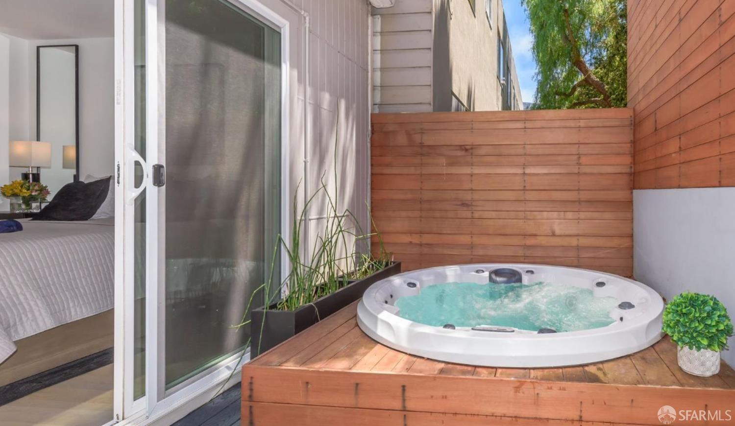 An exceptional condo located between Castro, Noe Valley, and Twin Peaks, with Kite Hill directly behind.This 2-bedroom, 2-bathroom unit features a panoramic window wall with stunning San Francisco cityscape views. The front deck spans the home's width, ensuring the open-plan living room, dining area, and kitchen are filled with natural light. The primary bedroom includes an ensuite bath and opens to a private, deeded patio. This outdoor oasis features a sitting area, hot tub, living wall, retractable canopy, and gate access to a common garden. Both bedrooms are generously sized and both bathrooms have been recently tastefully renovated. Situated on one story above a dedicated one-car garage, the property also includes additional loft storage, a dedicated laundry area, and an EV charger. There is a potential second parking spot available on the driveway. This stylish home offers a desirable alternative to a single-family home. It is also walkable to shops, restaurants, cafes, MUNI, tech shuttle stops, and parks. A must see!